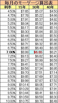 仮に30年ローンの利率が7.00%の場合、借入金$1000に対して、月$6.65(6ドル65セント)となります。借入金はその200倍ですから、毎月の返済額はその200倍である$1,330という事になります。この返済額には元金と利子の両方が含まれています。